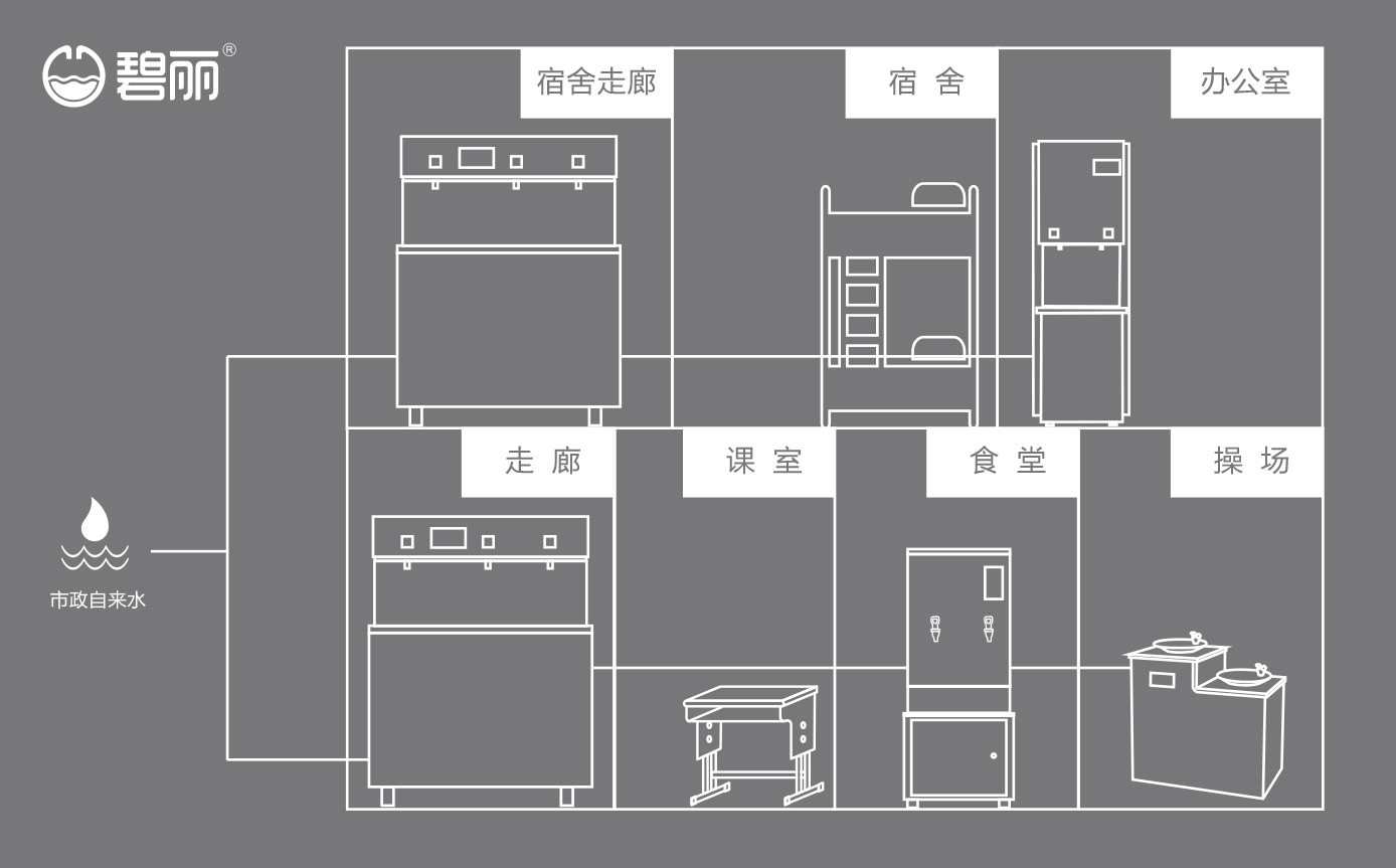 不同的飲水點(diǎn)可根據(jù)實(shí)際使用情況,安裝管線機(jī)或飲水設(shè)備或開(kāi)水器,使用戶能喝上開(kāi)水、溫開(kāi)水、純凈水等,來(lái)滿足不同場(chǎng)景的飲水需求;