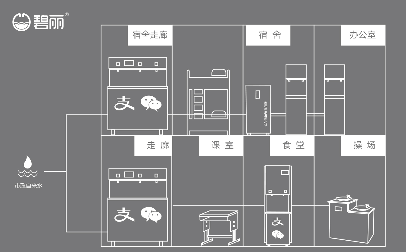 碧麗大型反滲透純水設(shè)備將自來(lái)水集中處理后,把優(yōu)質(zhì)的純凈水通過(guò)專(zhuān)用的供水管道輸送到各飲水點(diǎn);