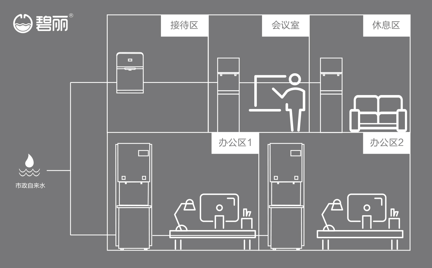 碧麗商用反滲透純水機(jī)將自來(lái)水集中處理后,把優(yōu)質(zhì)的純凈水通過(guò)專用的供水管道輸送到各飲水點(diǎn);